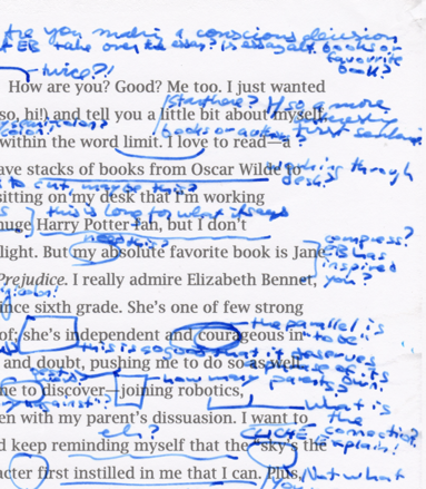 The student mentions that she now offers editing help to her friends at school—they have a lot to learn.